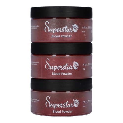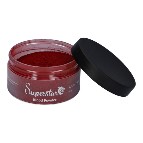 El Polvo de Sangre Superstar es ideal para crear sangrado activo (sangrado arterial). El polvo de sangre se puede diluir con agua, y si utilizas jarabe de glucosa o glicerina, obtendrás una sangre espesa (pegajosa). Ten en cuenta que el polvo de sangre solo contiene tinte, el líquido no se espesa.
