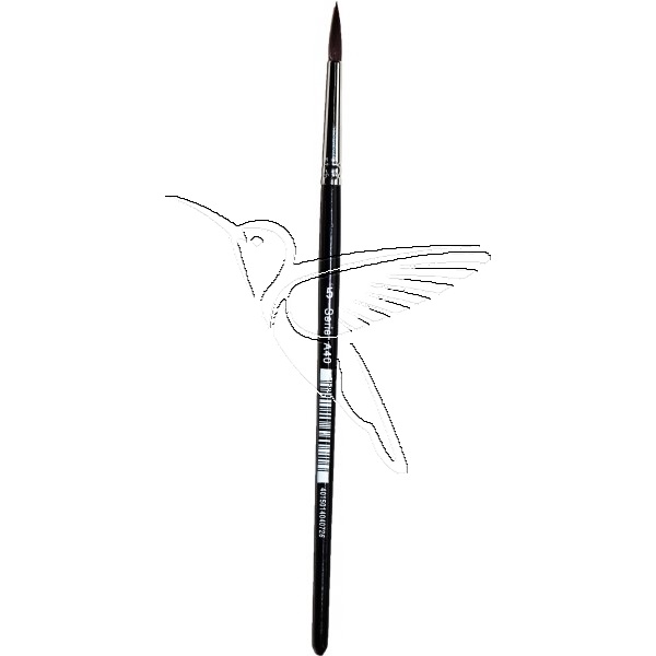 Pincel redondo nº 5, con pelo sintético burdeos, con una abrazadera transparente de color plateado y un mango corto lacado en negro.