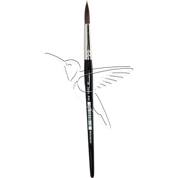 Pincel redondo nº 9, con pelo sintético burdeos, con una abrazadera transparente de color plateado y un mango corto lacado en negro.
