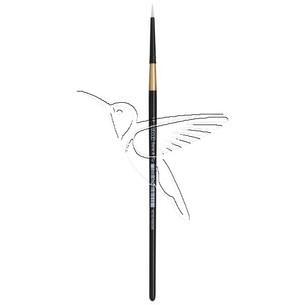 Pincel redondo nº 0, con pelo sintético blanco, con una abrazadera sin costuras de color plateado y un mango corto lacado en negro.