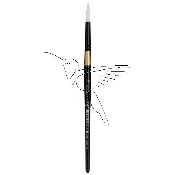 Pincel redondo nº 10, con pelo sintético blanco, con una abrazadera sin costuras de color plateado y un mango corto lacado en negro.